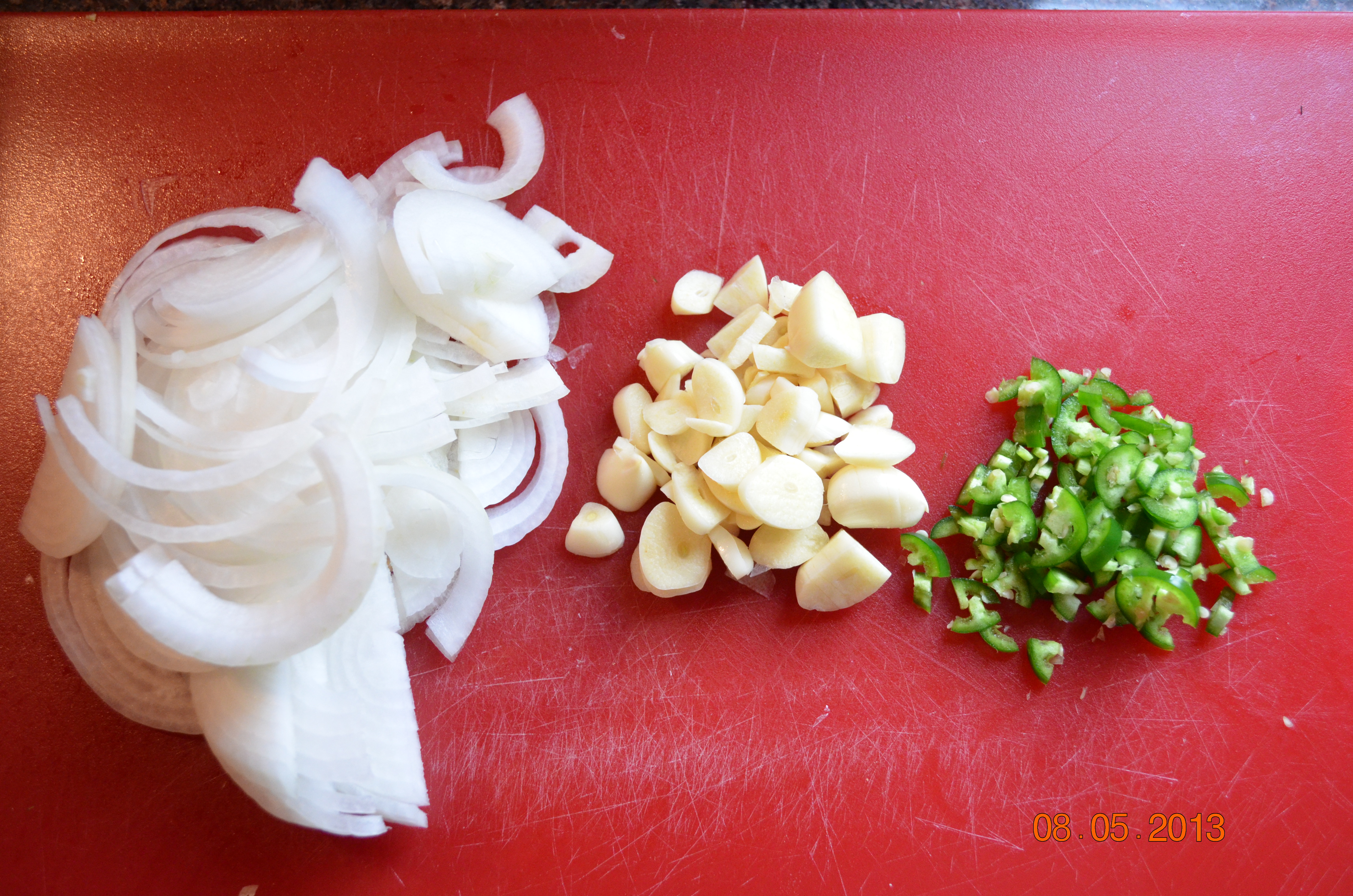 It’s time to prep. Cut up your Onion, Garlic, and Jalapenos. In a pot, heat the Oil on med. Add the Onion, Garlic, Jalapenos, and Salt. Don’t wait too long or the oil will splutter and burn you and/or the veggies.