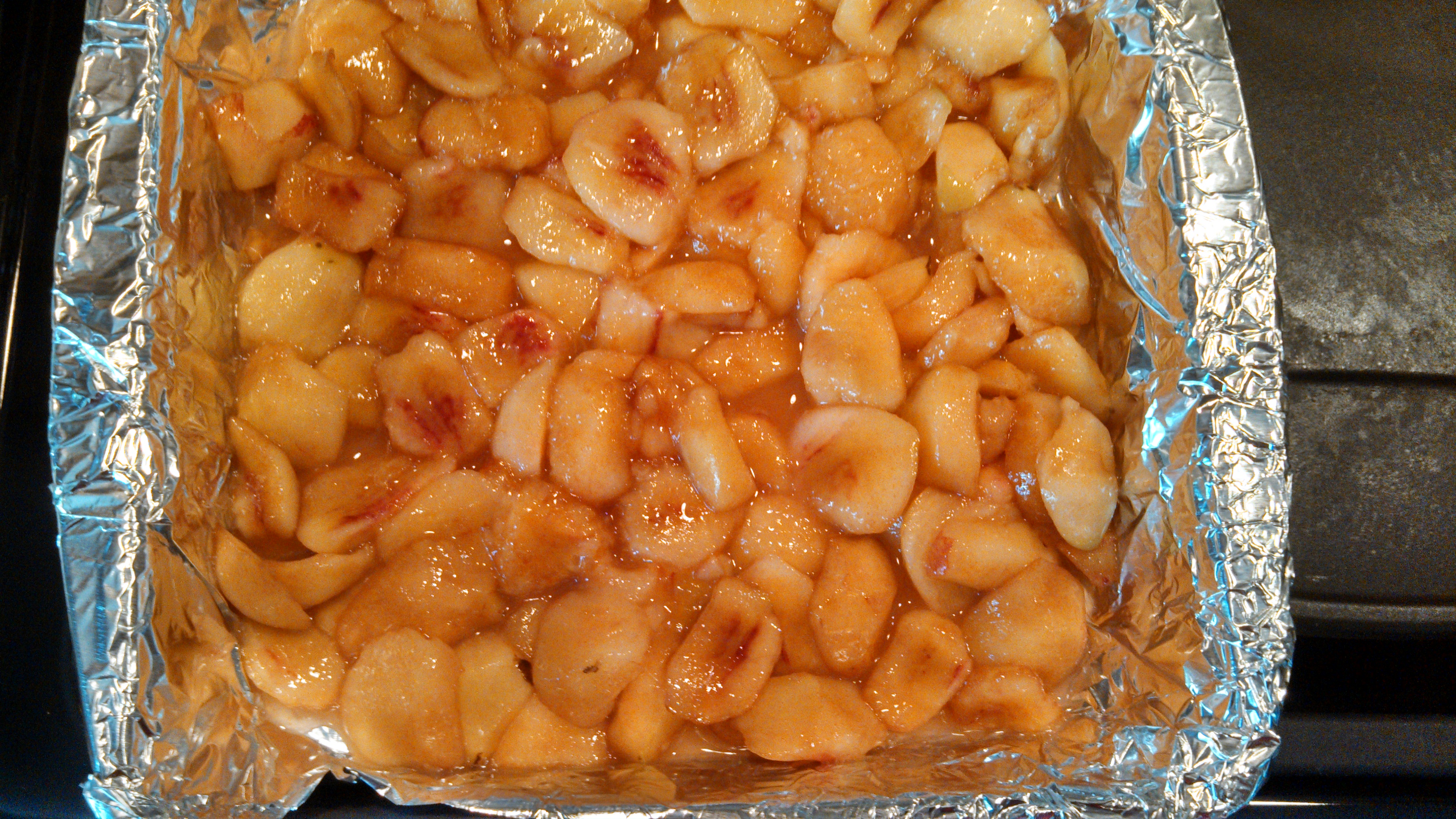 1. While whisking the reserved peach liquid with lemon juice and cornstarch, I forgot to add salt. After two minutes in the oven I remembered. I quickly pulled out the peaches and sprinkled some salt over the top.