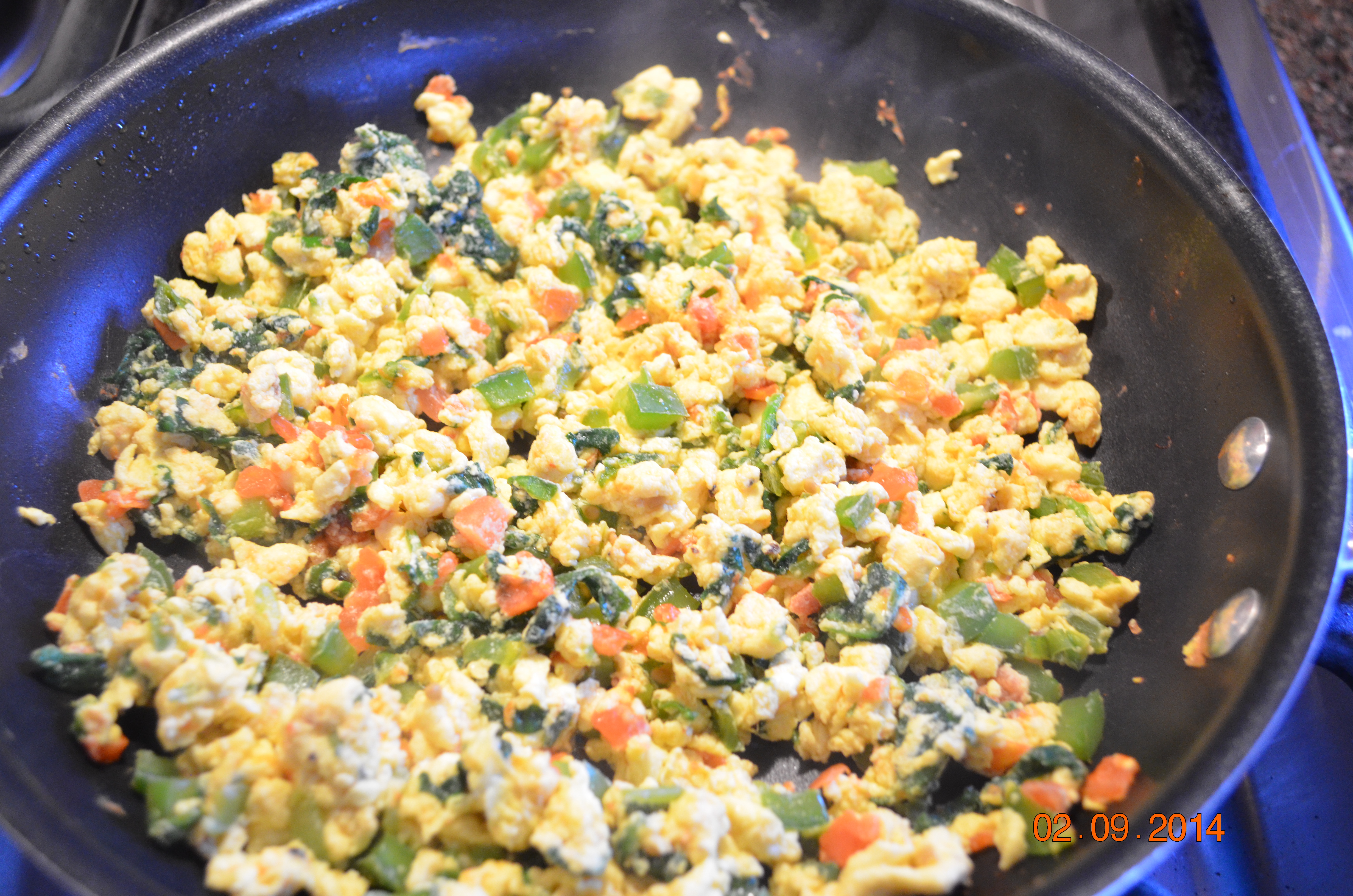 Once the kale has wilted, pour in the Egg Whites. Stir. Break up all the large chunks and keep stirring. I find it easier to use a spoon instead of a spatula. But then again, I’m using a spatula that is curved (don’t ask how).