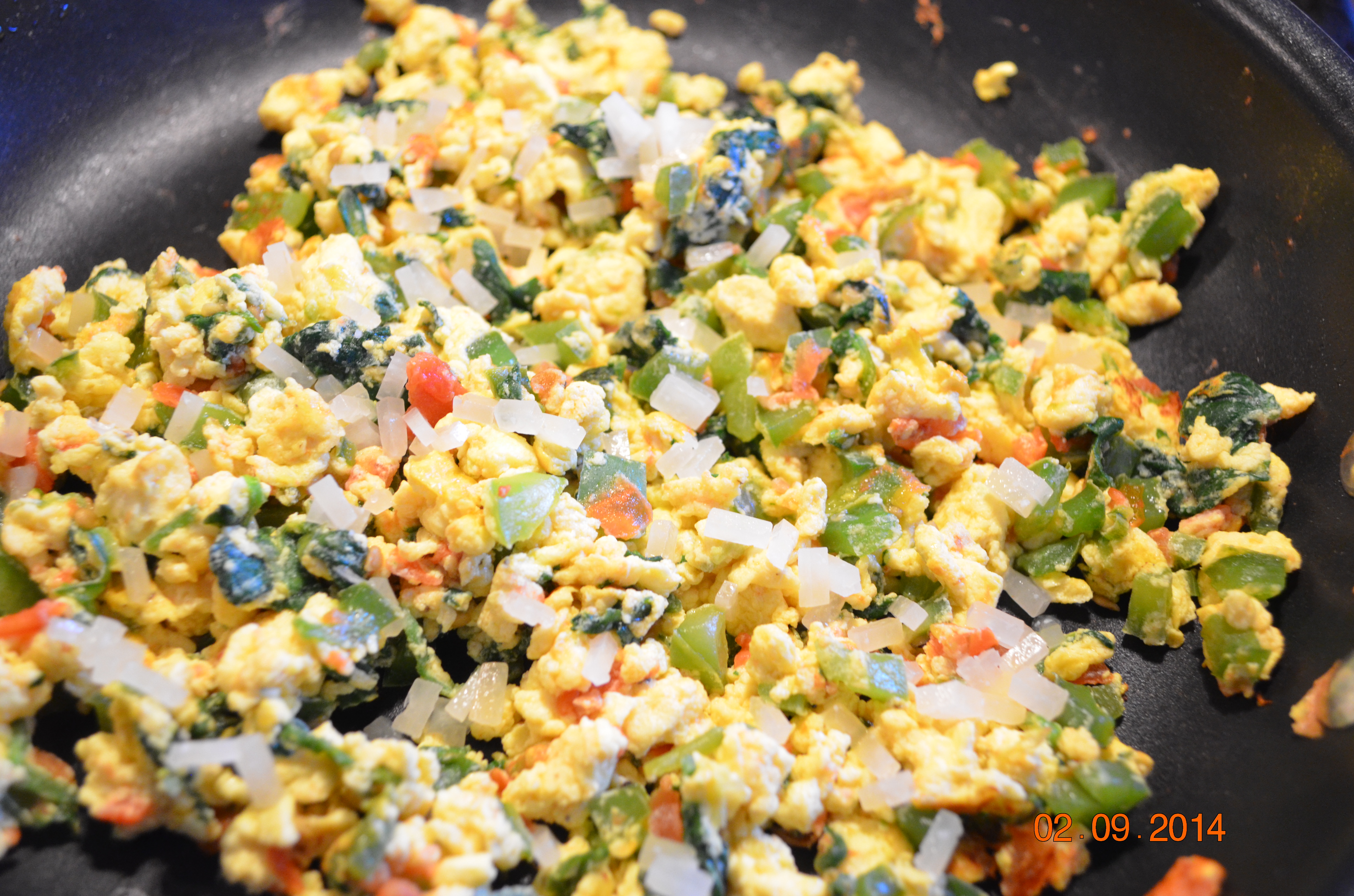 What I like best about my scrambled eggs is that you can use whatever vegetables you like. This is is where the flavor comes from – fresh veggies. Last summer we discovered kale. One week, the store was out of baby spinach, and so we tried kale and, well, it was delicious. Uncooked, it’s bitter, but saute it for a minute and a mild sweetness comes out.