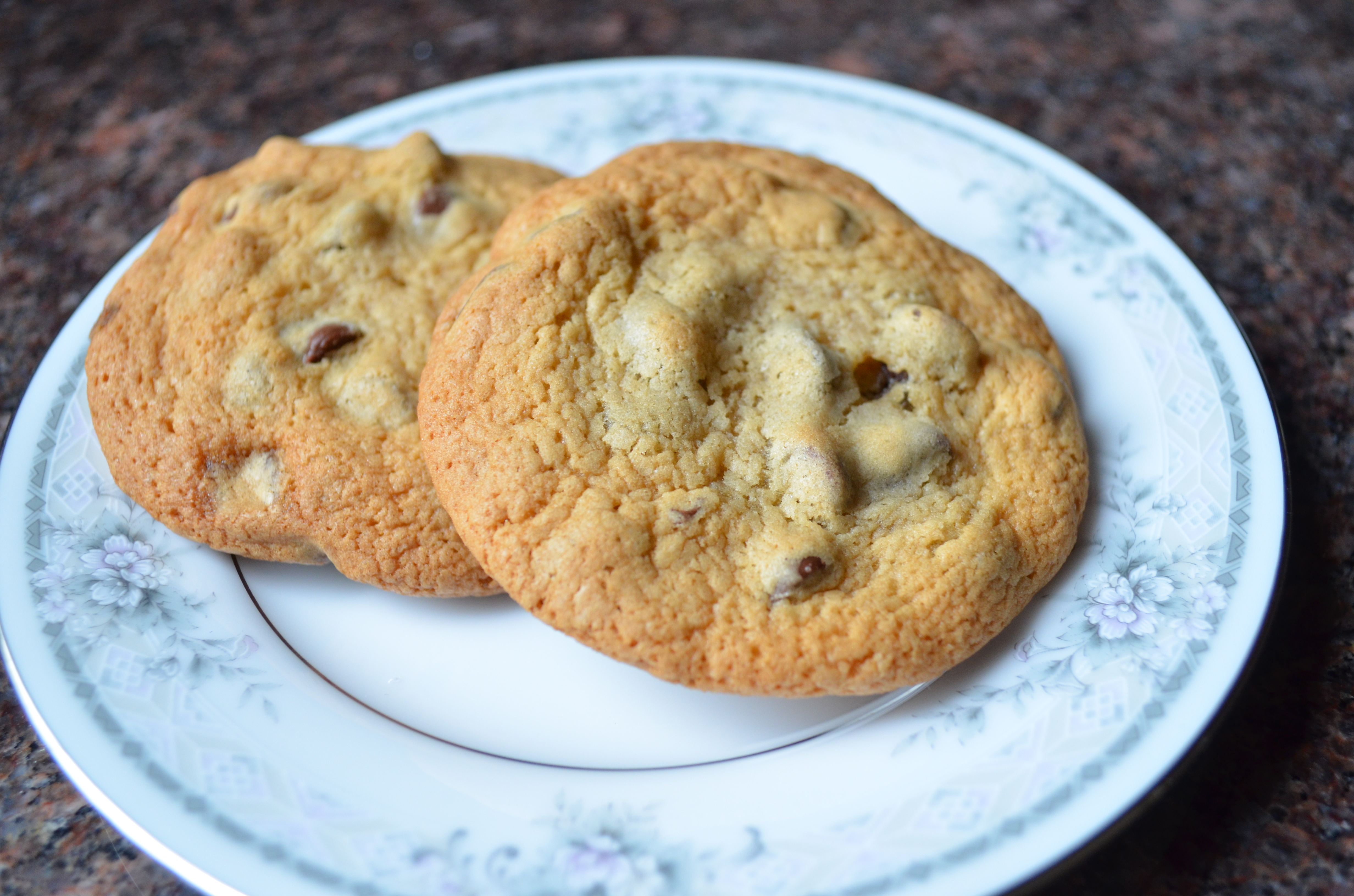 Nothing fancy going on here (despite the plate). These cookies are lovely, but get stale after four or five days. Hopefully, yours won’t linger that long. These guys are BIG. Granted, I used 2 tbsp per cookie, but they spread. I was able to work in batches of six, but I cranked out 20 instances of yummy goodness.