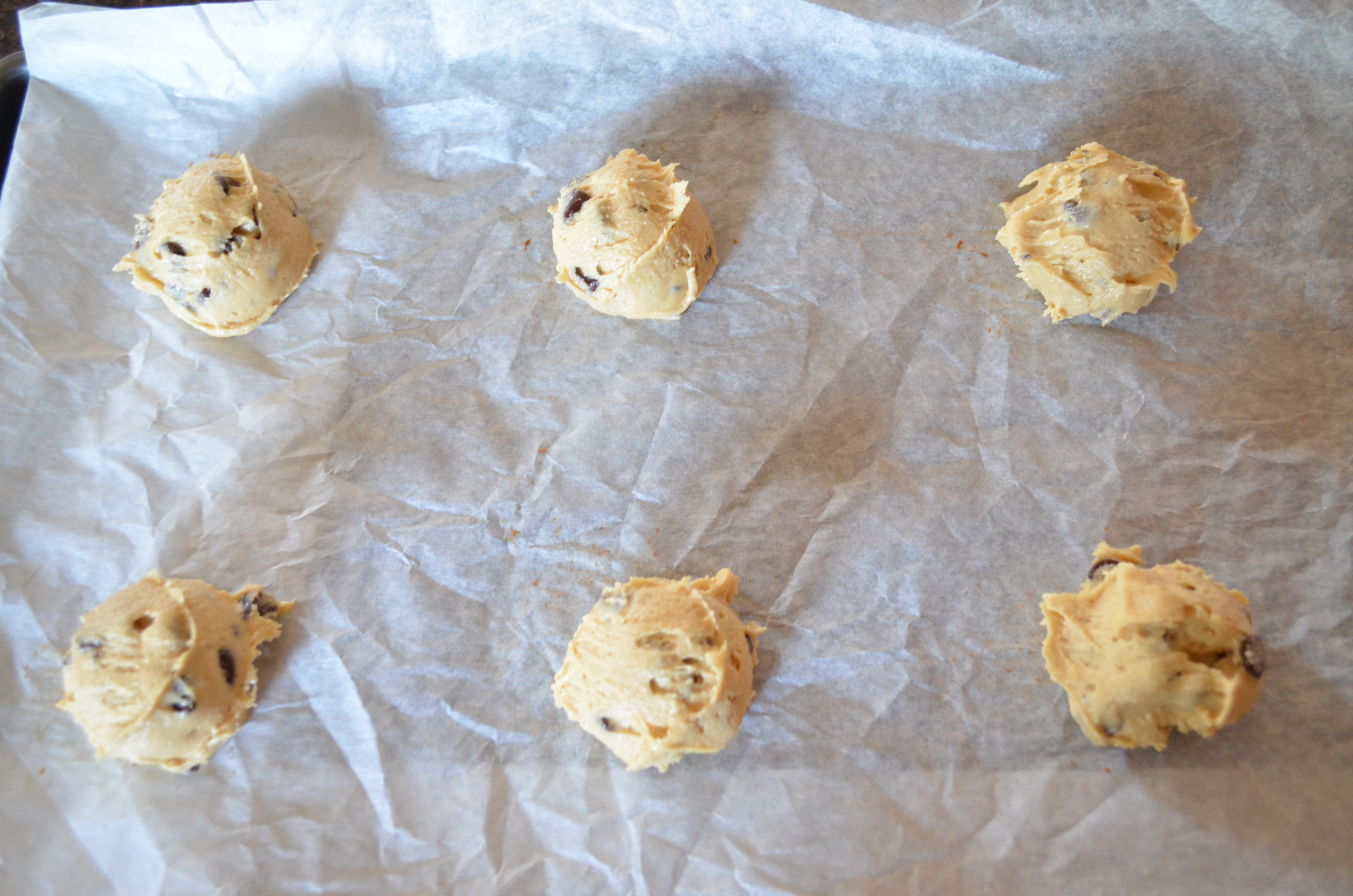 Next add Eggs and Vanilla. Blend. Add Baking Soda and Salt. Slowly add the Flour. I mixed it in three batches. With a silicone spatula, fold in the Chocolate Chips.
