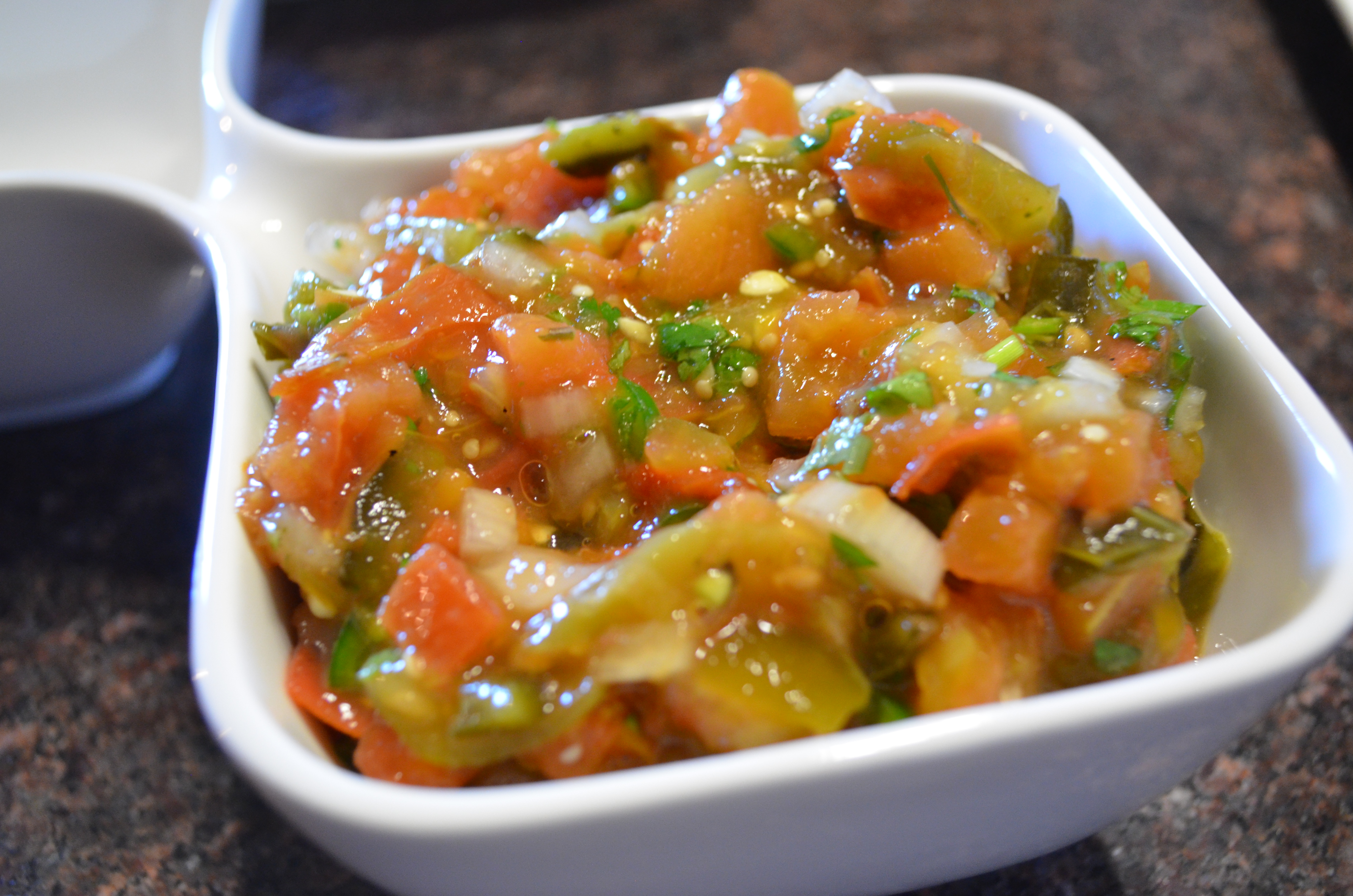 Really not much to say about this. I like a chunky salsa so I prepared this by hand trusting to my questionable knife skills. If you’re not comfortable with blades there’s always the food processor. You can also vary the texture if you want a smooth salsa.
