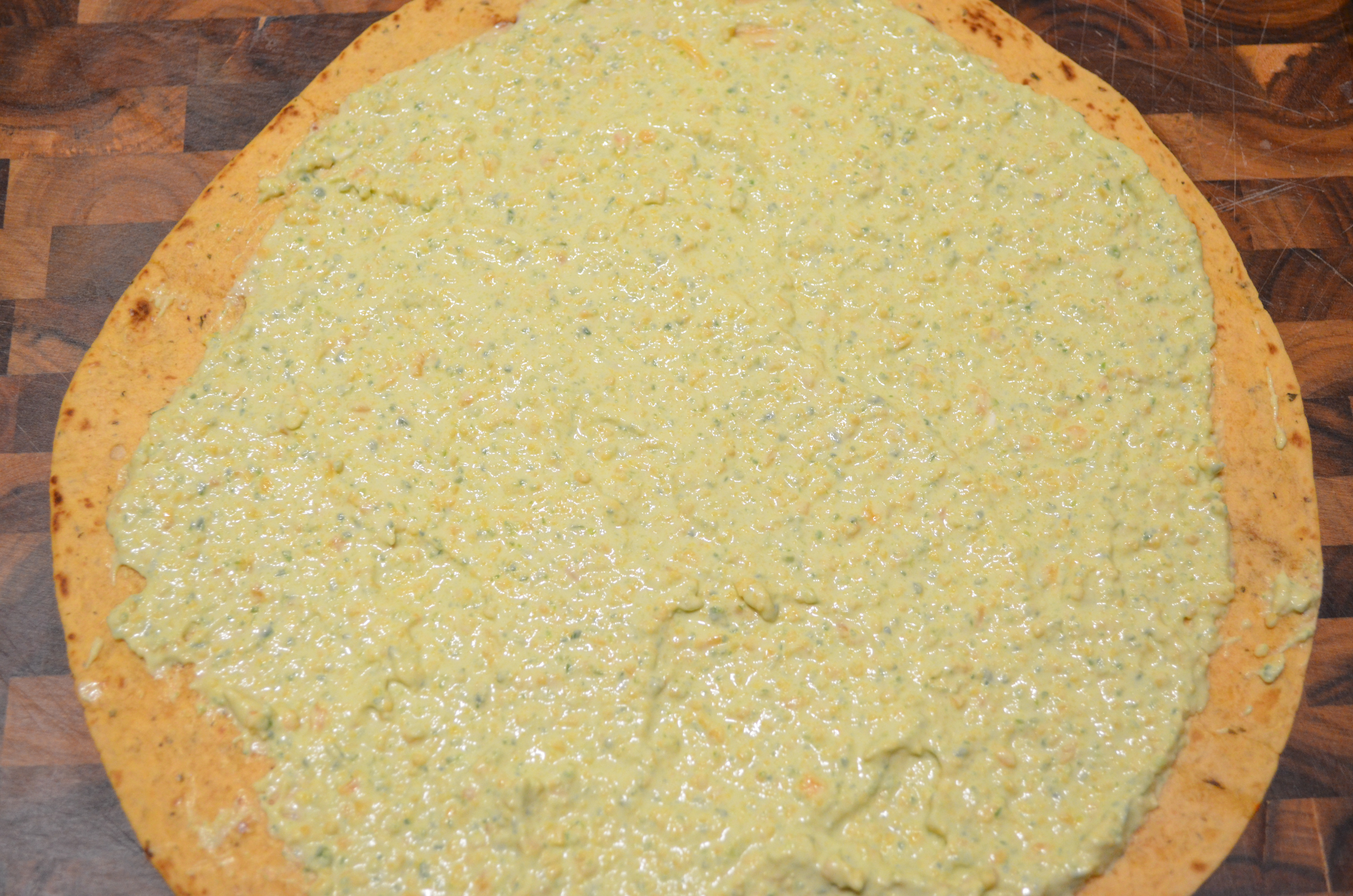 Spread the mixture on the Tortilla. The thickness of the spread is to your preference. Roll the tortilla and wrap it in a damp paper towel. Refrigerate for at least 30 min.