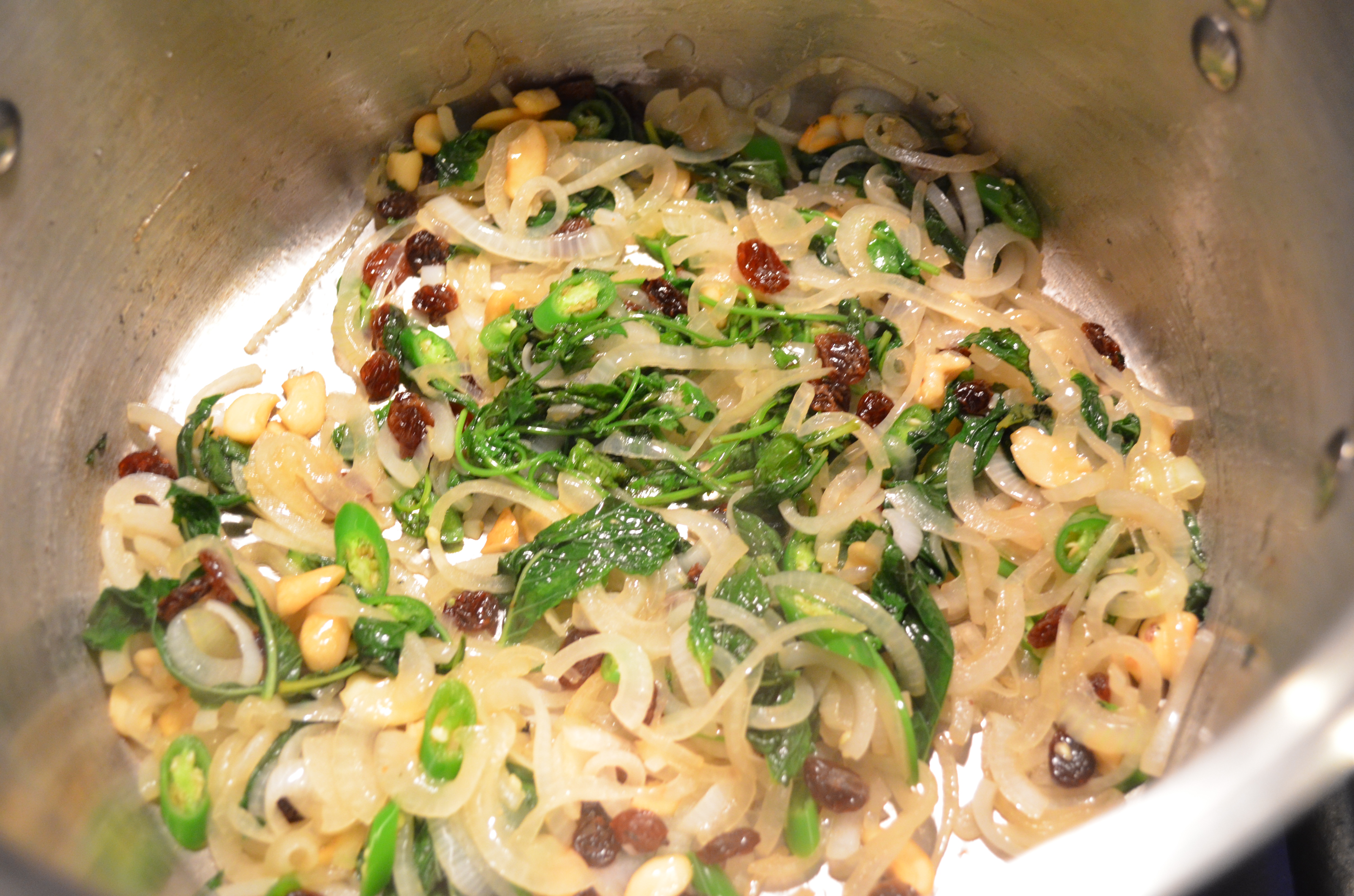 Once the Cashews turn golden, add the sliced Onions and Salt. After the onions get some color, toss in the Cilantro, Mint, and Green Chilies. Keep stirring so nothing burns. Let cook for a couple minutes.
