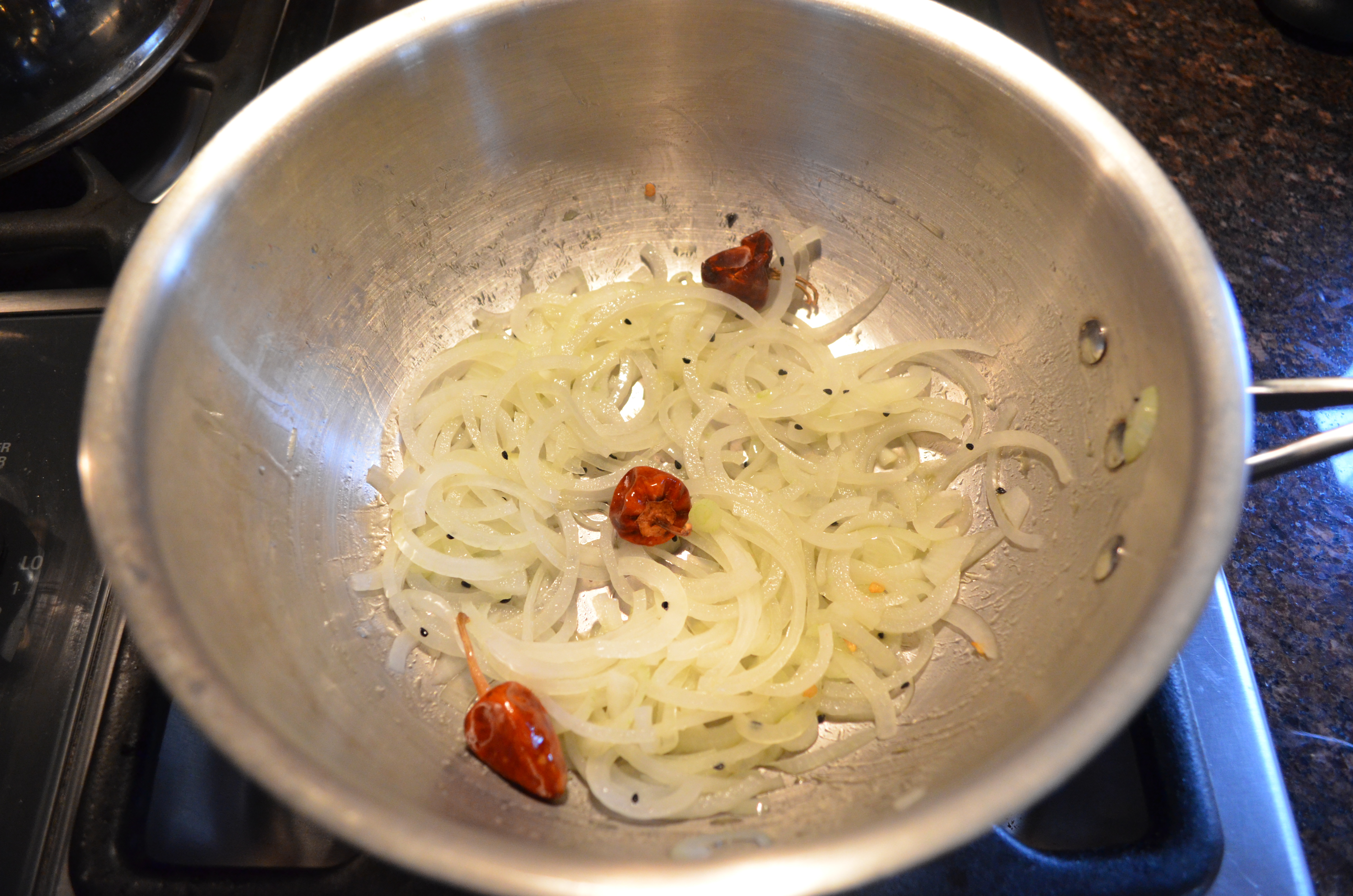 In a pot or skillet with a lid, heat the Canola Oil over medium heat. Add the dried Chilies and let it roast for a minute. Toss in the Onions, Salt, and Onion Seeds. Stir to keep from burning.