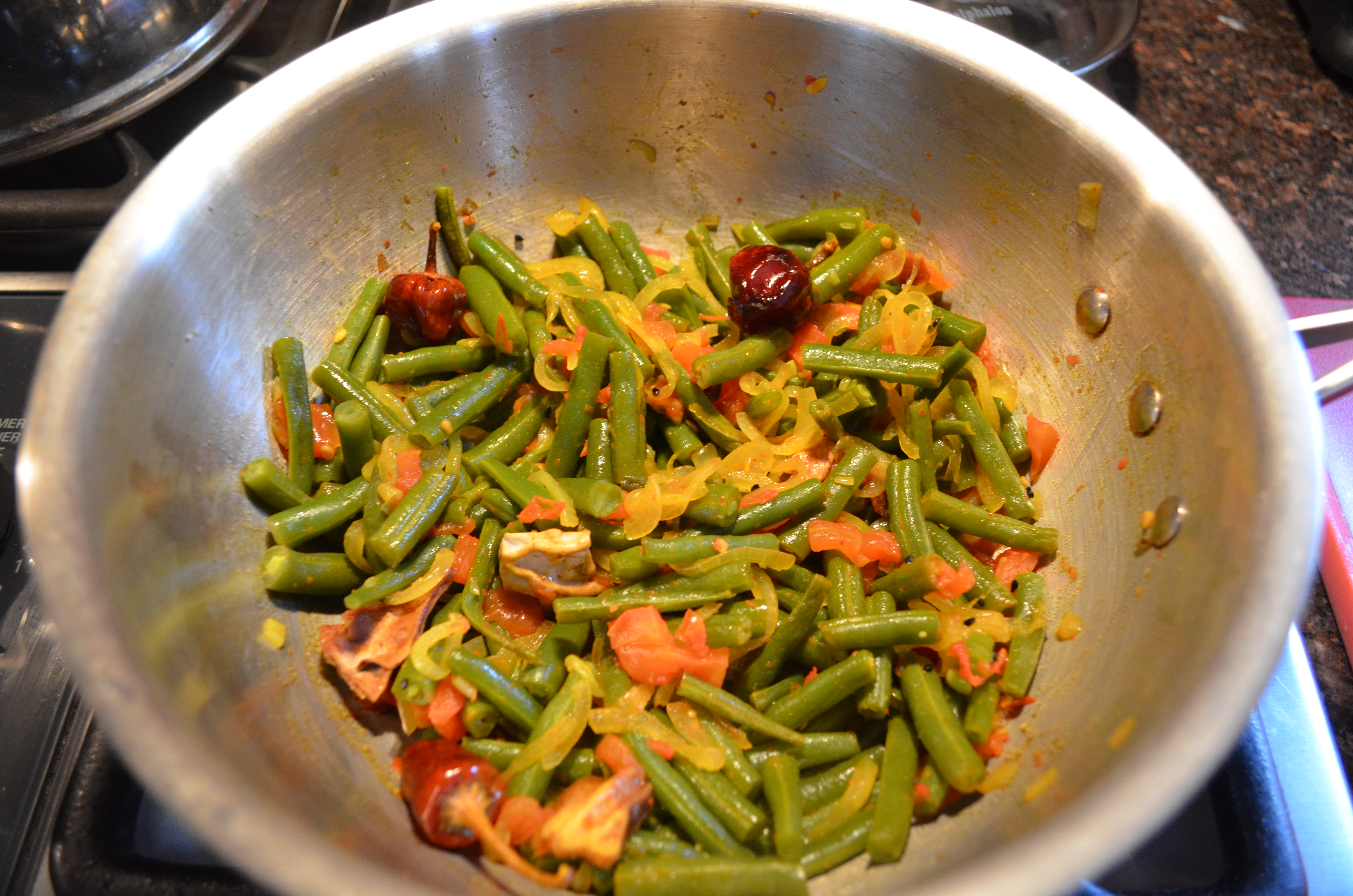 Add Tomatoes and Amchur. Cover and cook over medium low until the liquid evaporates. This should create enough steam to cook the green beans, but leave them firm. Enjoy!