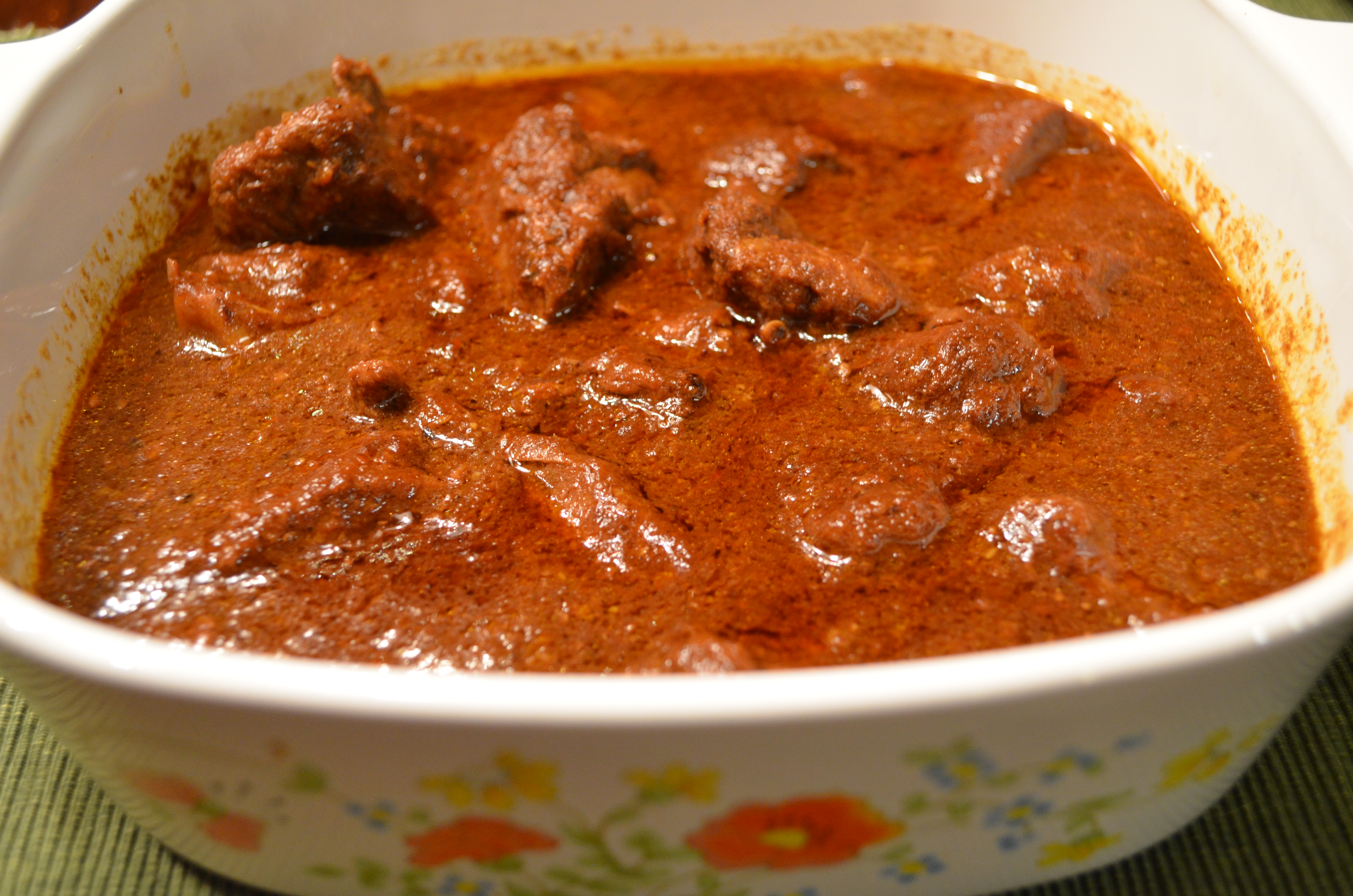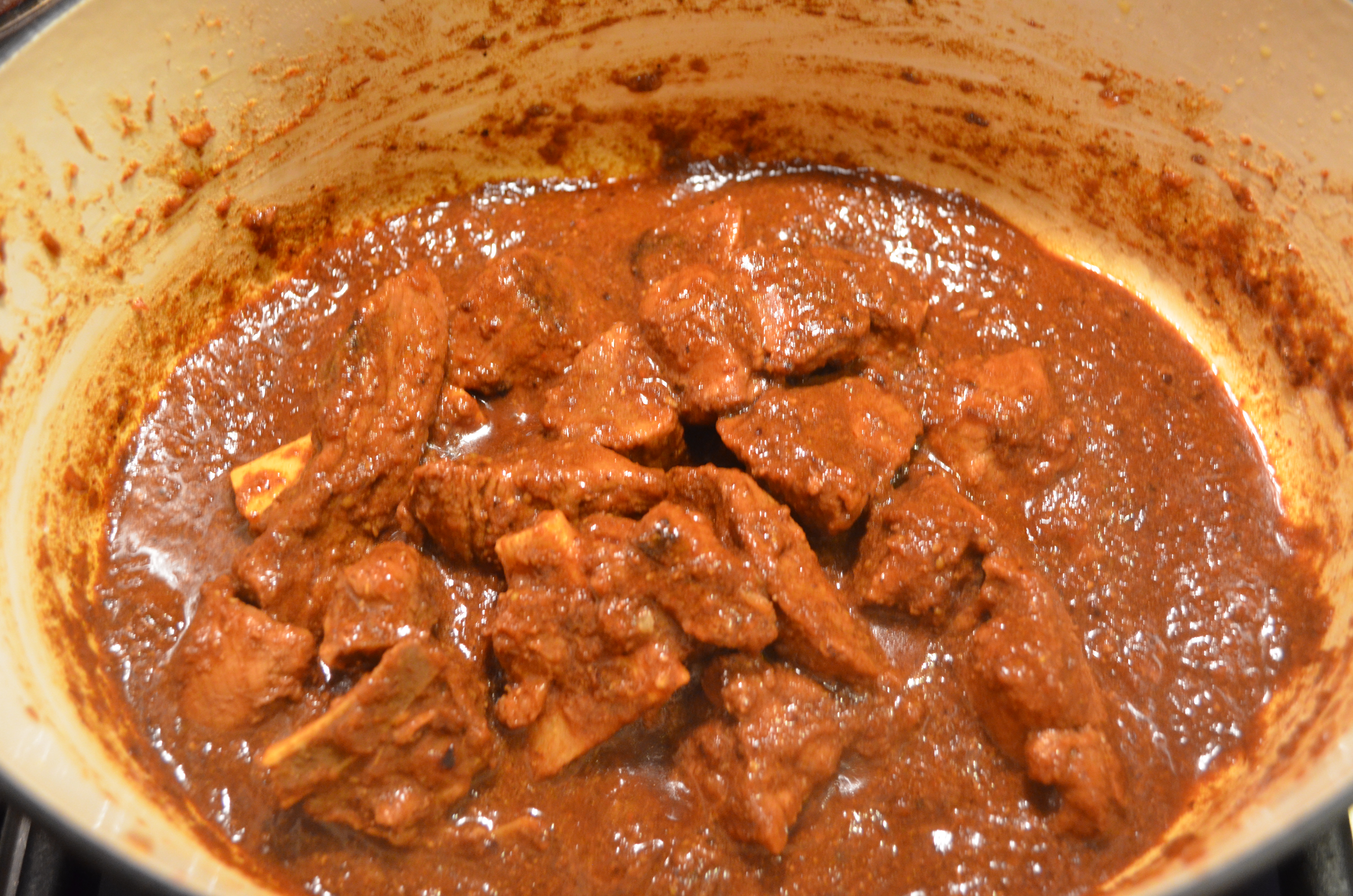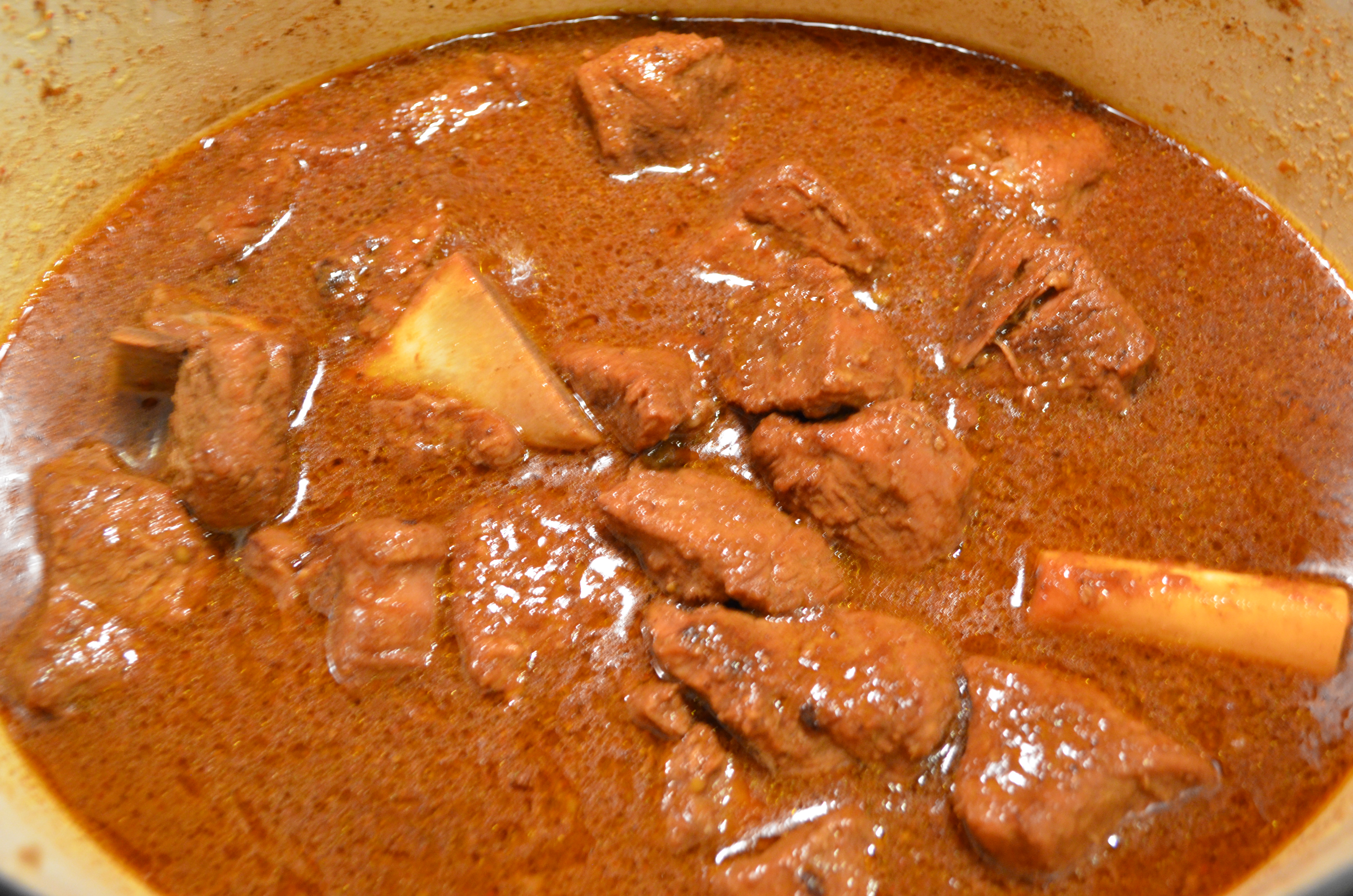 Take out the meat and set aside. Pour in the Yogurt and mix well. The curry will thicken and turn a dark reddish brown. Return the meat to the pot. Add another 1/2 cup to a full cup of water. Bring to a boil then reduce the heat to a low simmer. Cover and cook until the meat becomes melt in your mouth deliciousness – about 20 min.