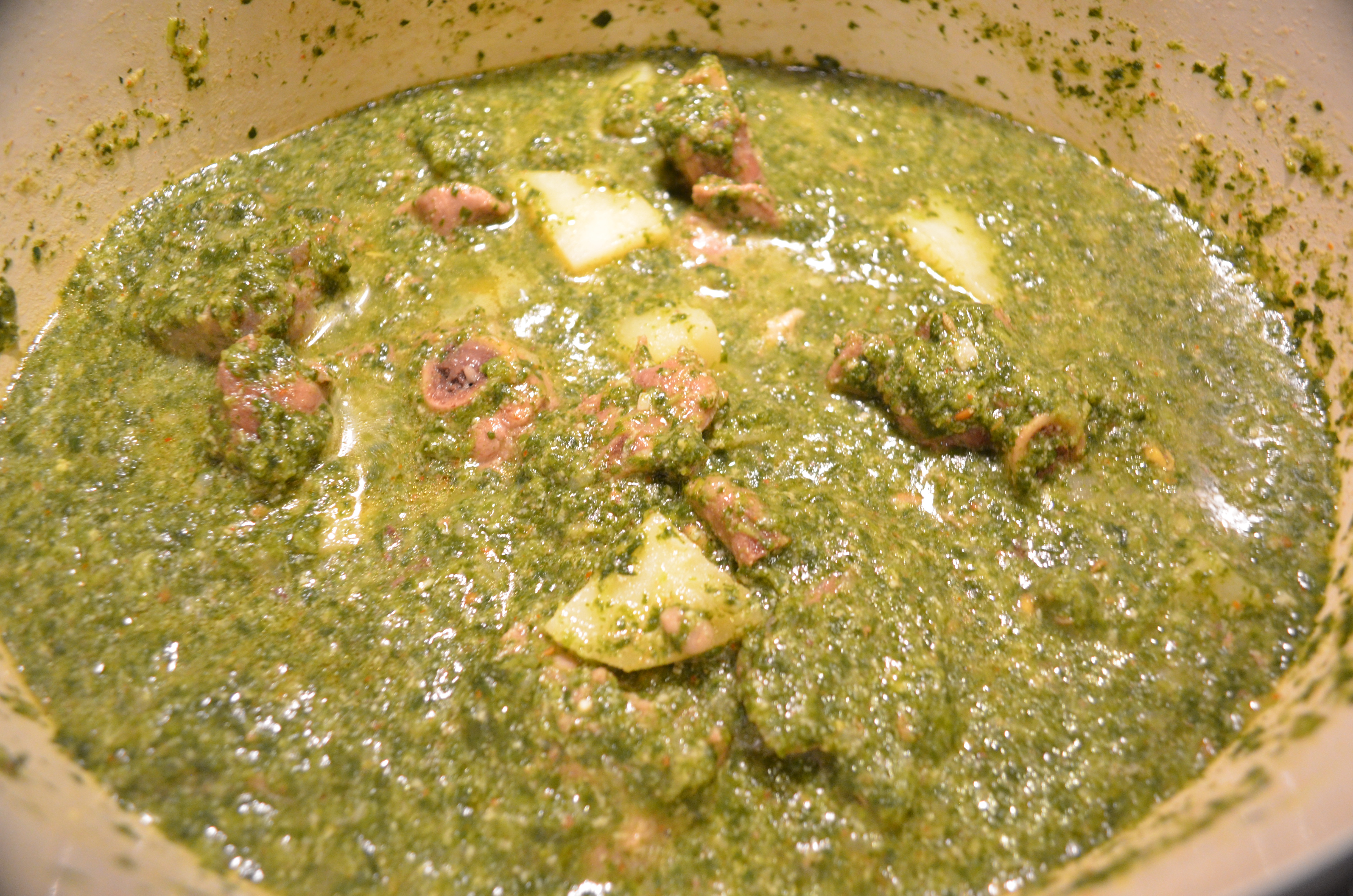 Pour in the Spinach paste to the lamb curry. Mix well and let it cook for another 10 min. I returned the meat to the pot and stirred things about.